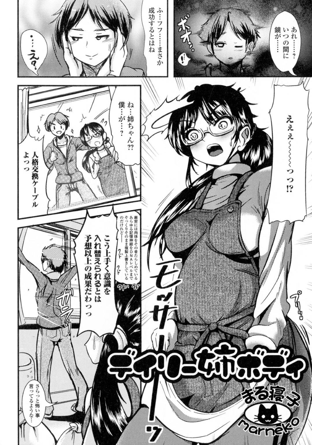 引き籠りのマッドサイエンティストの姉の発明で、何故だか姉と身体入れ替わる弟は、巨乳ムチムチボディに女体化した弟は着飾って歩いていると男の人の目線が気になってしまいおかしな気分になり、お隣の男子を誘惑しトイレで生挿入されバックで中出しセックスする