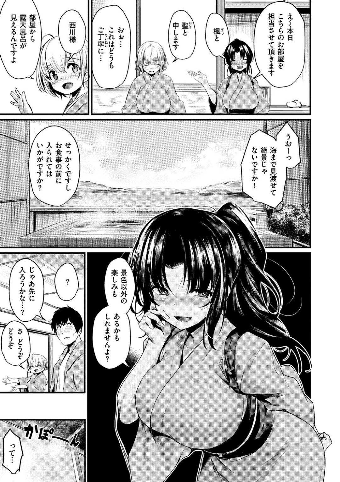 【ご奉仕エロ漫画】旅館で二人の巨乳美女な中居さんがおっぱいを埋めるようにお客さんをご奉仕して精液をぶっかけられちゃう!【きづかかずき】