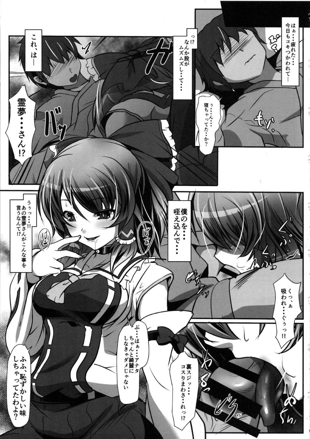 【東方project エロ漫画】普段は凛として巫女の仕事をこなす霊夢は、夜になると豹変し主人公を逆レイプでフェラして襲う【シメジ藻】
