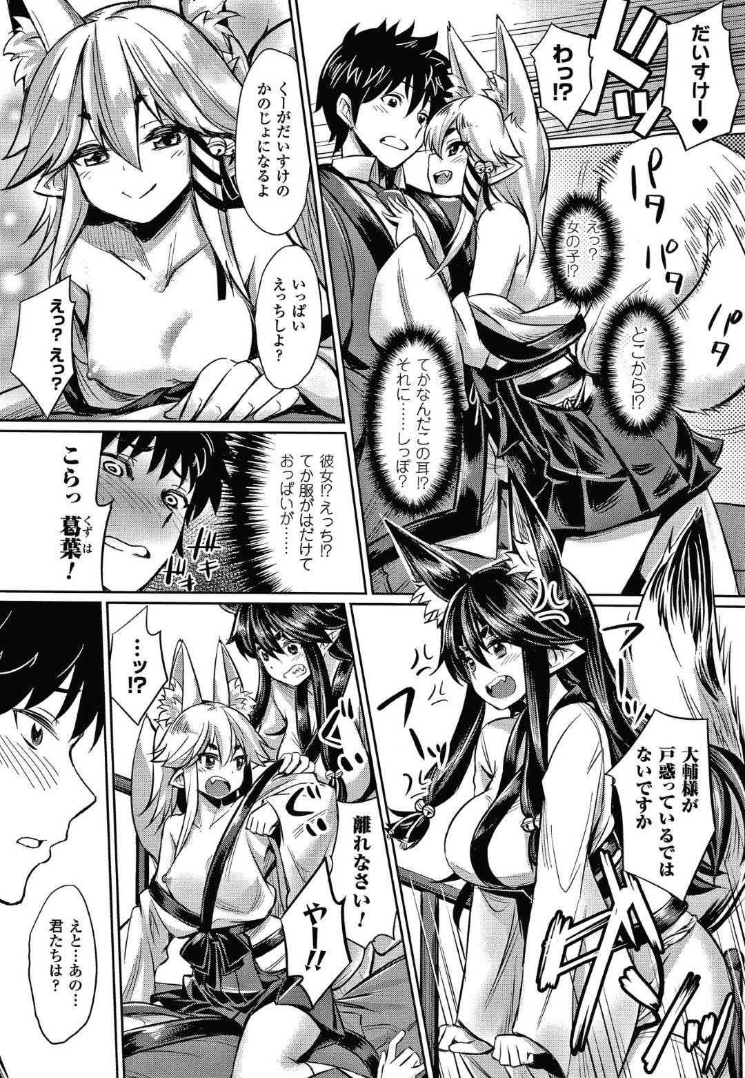 【妖狐イチャラブ3Pエロ漫画】神社の管理人である男の元に2人の妖狐が現れ誘惑されると3Pイチャラブ中出しセックスでアクメする【yasu】