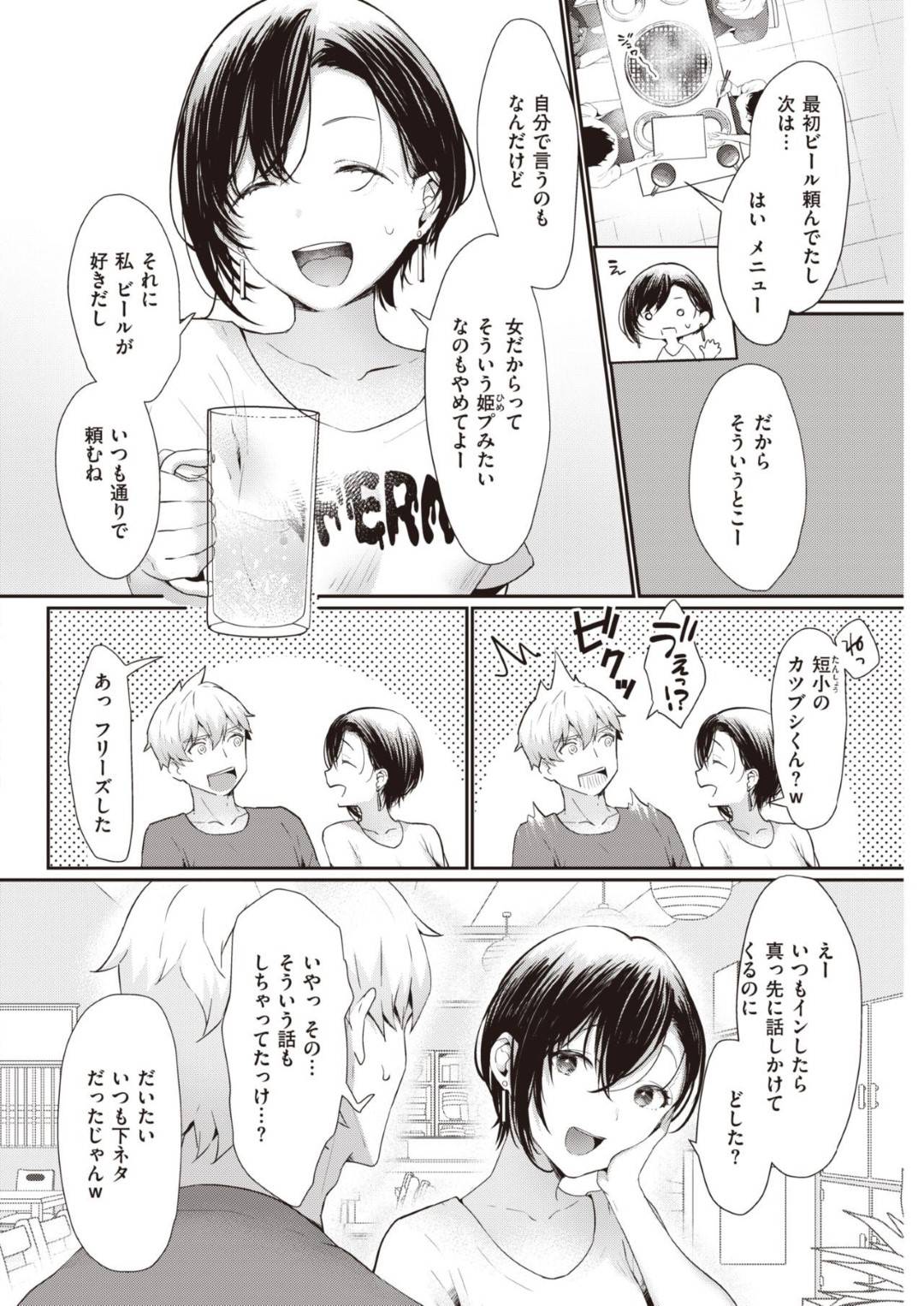 【三角関係エロ漫画】孝太郎は我慢できず美雪の服を肌蹴けさせるも拒否され、後輩の吉乃に慰めてもらい中出しセックスで筆下ろし【yasu】